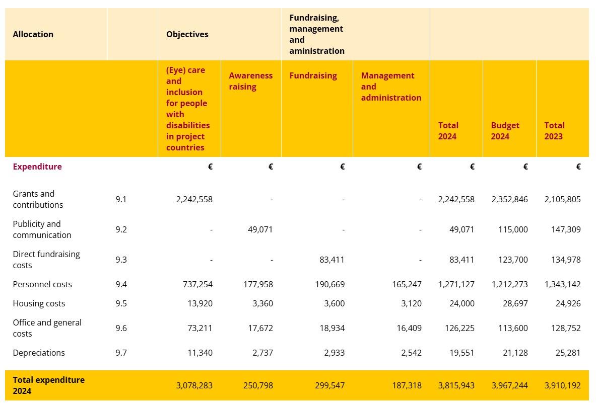In 2024, we were able to devote 87.2% to our objective (2023: 82.5%) by spending relative less on fundraising, and management and administration. Of the 87.2%, 80.7% was spent on projects for inclusive development, strengthening the rights of people with disabilities, and eye care worldwide; 6.5% was spent on awareness-raising and educational activities concerning the need for inclusive development in development cooperation.