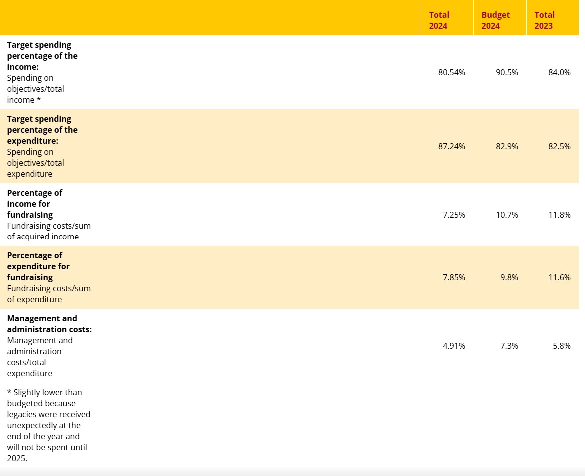 The budget for 2025 assumes an expected income of more than 3.5 million. The percentages remain at a favourable level compared with sector benchmarks. SeeYou strives to raise funds in a timely manner so that we can safeguard continiuty in the project countries. As a result of this approach, funds for projects are often received in the current year and spent in the following year. These funds are visible as allocated funds. This has a strong influence on the target spending percentage of income. In 2024, this was slightly lower than the previous year (80.5% in 2024 and 84% in 2023 due to a large proportion of legacies that were not spent anymore in 2024. This can be seen in the higher target spending percentage (99%) of the budget in 2025.