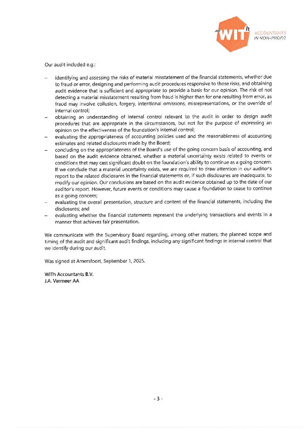The executive director’s annual salary (as an employee) remains below the maximum of € 129,292 (1 FTE/12 months, 1 July 2024), which is in line with the Dutch base score for executive positions (BSD) score of 380 points according to the Regulation on salaries for directors of charity organisations.