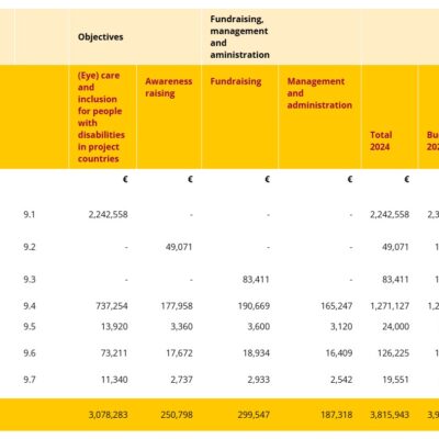 In 2024, we were able to devote 87.2% to our objective (2023: 82.5%) by spending relative less on fundraising, and management and administration. Of the 87.2%, 80.7% was spent on projects for inclusive development, strengthening the rights of people with disabilities, and eye care worldwide; 6.5% was spent on awareness-raising and educational activities concerning the need for inclusive development in development cooperation.